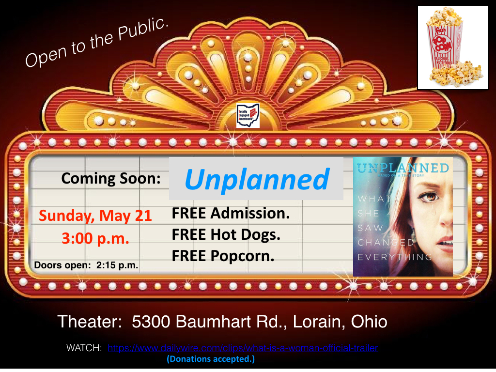 Banquet Hall 5300 Baumhart Road, Lorain, United StatesTEA is pleased to offer a FREE Movie viewing of "Unplanned: What she saw changed everything" this Sunday, May 21, at 3:00 p.m. Doors open at 2:15 p.m. Theatre location: 5300 Baumhart Rd., Lorain, Ohio (MAP) BRING a friend. Donations accepted! (FREE Popcorn and Hot Dogs while supplies last.) WATCH MOVIE TRAILER BYOB - Bring your own … Continue reading FREE Movie! FREE Popcorn! FREE Hot Dogs
