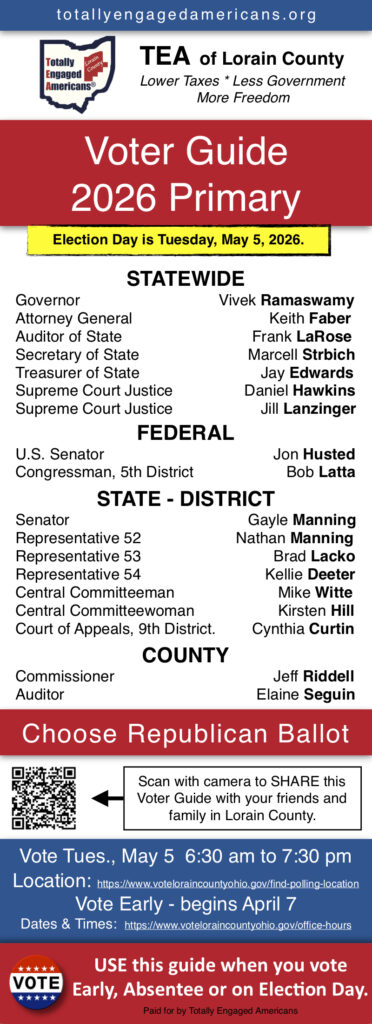 Lorain County, Ohio – Totally Engaged Americans (TEA) is proud to announce their voter guide for the 2026 Primary Election. TEA recommendations for the offices of County Auditor to Governor of Ohio can be seen on the TEA voter guide.