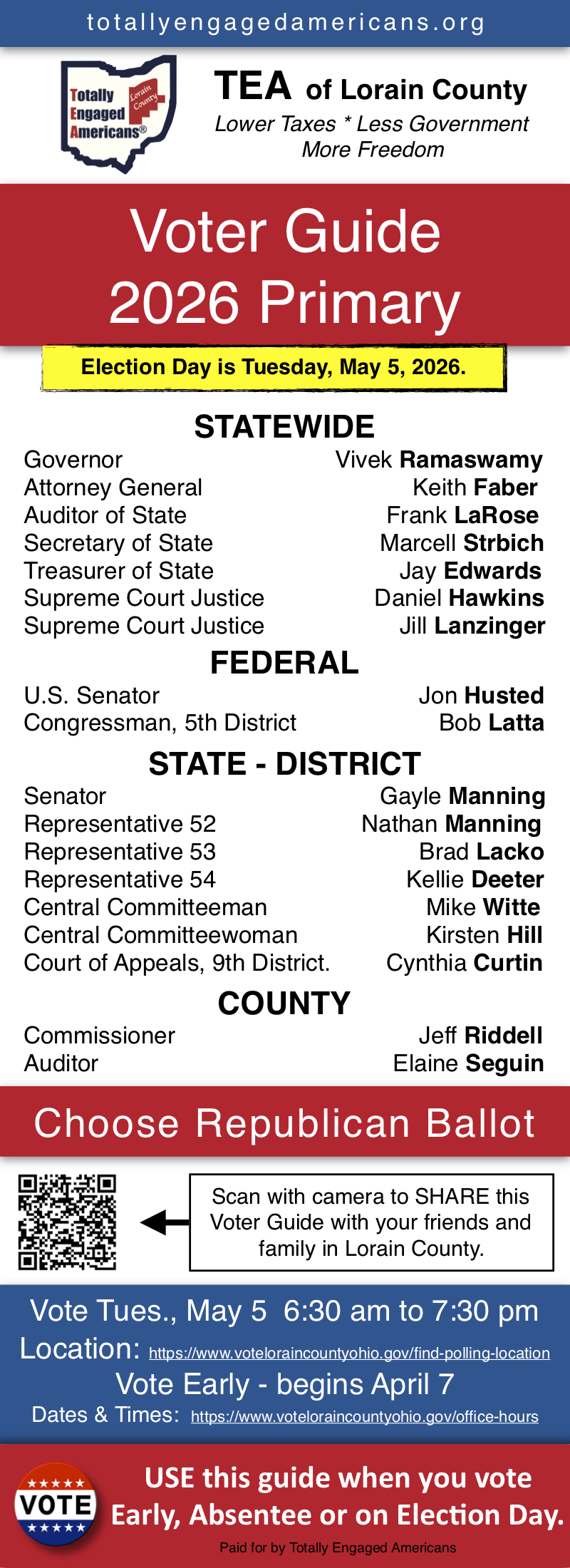 The ‘TEA Voter Guide 2026 Primary’ recommendations were determined by straw polls of TEA members conducted in January through March, 2026. To see the list of all candidates in Lorain County, Ohio, click here.